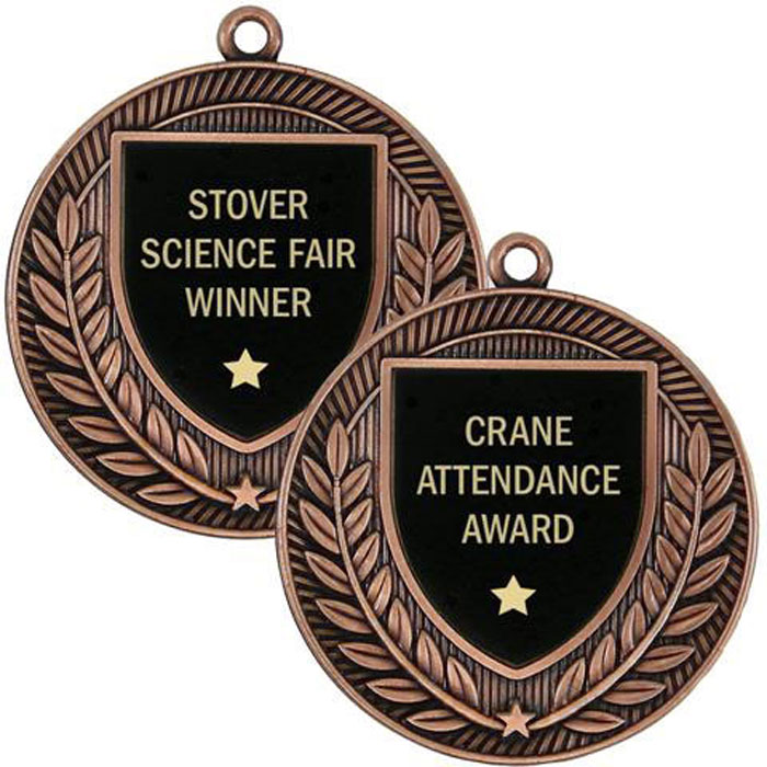 Add the perfect wording to the front of your medal. This 2" antique bronze medal is designed to accommodate a laser engraved plate on front. Looks perfect with our 5002 neck ribbon. Three free lines of personalization. Maximum 12 characters per line. Shipped fully assembled within 3 days after receipt of order. Allow additional time for shipping.