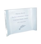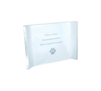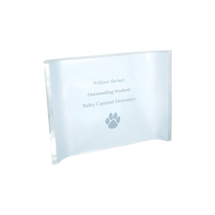 The beauty of this award is the simplicity of the design. It is comprised of a substantial acrylic curve with wording and logo etched into the surface. The curved design allows the award to stand freely on any flat surface. Free engraving included. Shipped fully assembled in 3 business days. Order now and get a $.50 discount per item for entering engraving text online!