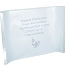 The beauty of this award is the simplicity of the design. It is comprised of a substantial acrylic curve with wording and logo etched into the surface. The curved design allows the award to stand freely on any flat surface. Free engraving included. Shipped fully assembled in 3 business days. Order now and get a $.50 discount per item for entering engraving text online!