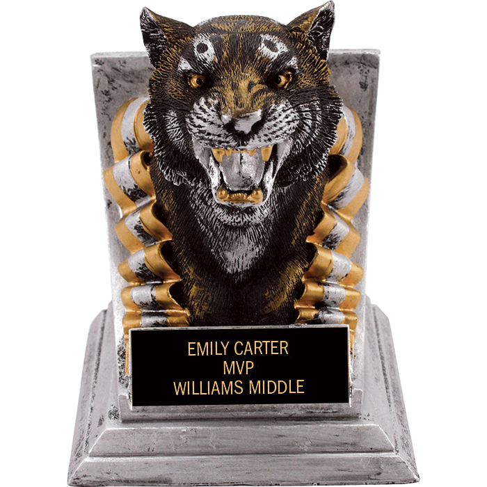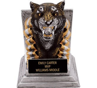 Celebrate your school spirit and thrill your recipients with these detailed mascot trophies. These beautiful awards feature fine detail on a substantial resin trophy. Engraved to your specification, these high definition trophies ship fully assembled in just three days. As always, engraving is included in the price. Please allow additional time for shipping. Order now and get a $.50 discount per item for entering engraving text online! Size: 3" x 4"