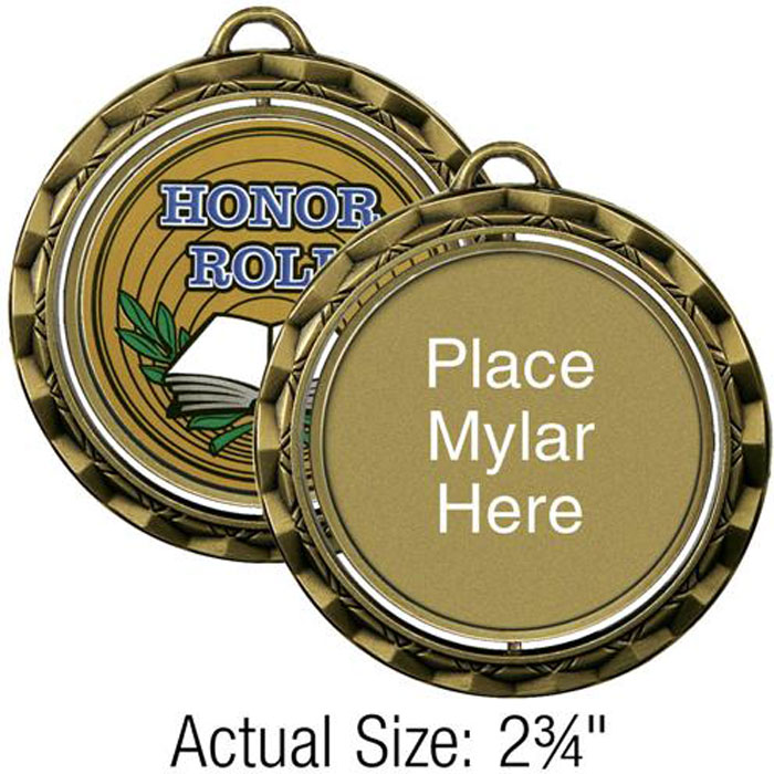 Versatile thanks to our enormous selection of mylars in academic, athletic, activity and other titles. The center of this heavy 2.75" cast medal rotates to show off two different mylars! Price includes the two 2" mylars, shipped unattached. Ships within 24 hours. Sorry, this item cannot be engraved.