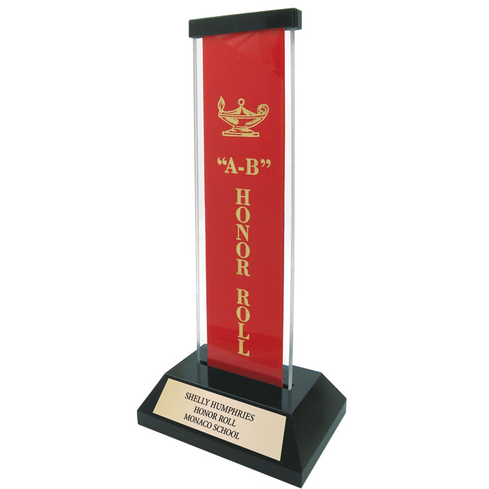 Jones Exclusive! A 10" acrylic trophy with the gorgeous color and foil of our ribbon line. Includes one of our premium, full-sized, flat ribbons. We'll laser print your personalized text on gold foil. Quantity discounts apply to trophies using the same ribbon title. Shipped within 3 days after receipt of order. Allow additional time for shipping. Order now and get a $.50 discount per item for entering engraving text online! Size: 4.1875" x 10"