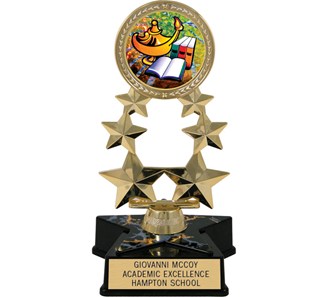 Lots of magnificent stars for your superstars! Even the base is star shaped. Choose your style trophy and any of our over 100 mylar titles. Includes an engraved plate. Order now and get a $.50 discount per item for entering engraving text online! Ships in 3 business days. Size: 4" x 7"