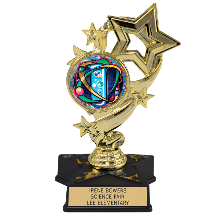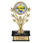 Lots of magnificent stars for your superstars! Even the base is star shaped. Choose your style trophy and any of our over 100 mylar titles. Includes an engraved plate. Order now and get a $.50 discount per item for entering engraving text online! Ships in 3 business days. Size: 4" x 7"