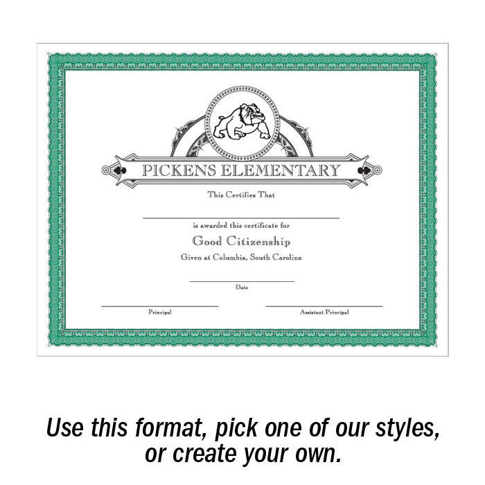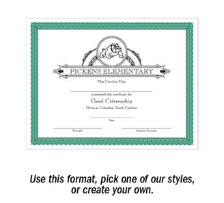 Create your own 8.5" x 11" traditional certificate! This traditional border is the starting point for designing your own certificates. Now , getting a unique look for your school couldn't be easier. Pick your paper, pick your layout and provide details! Minimum order of 50. Ships in 4-7 days.