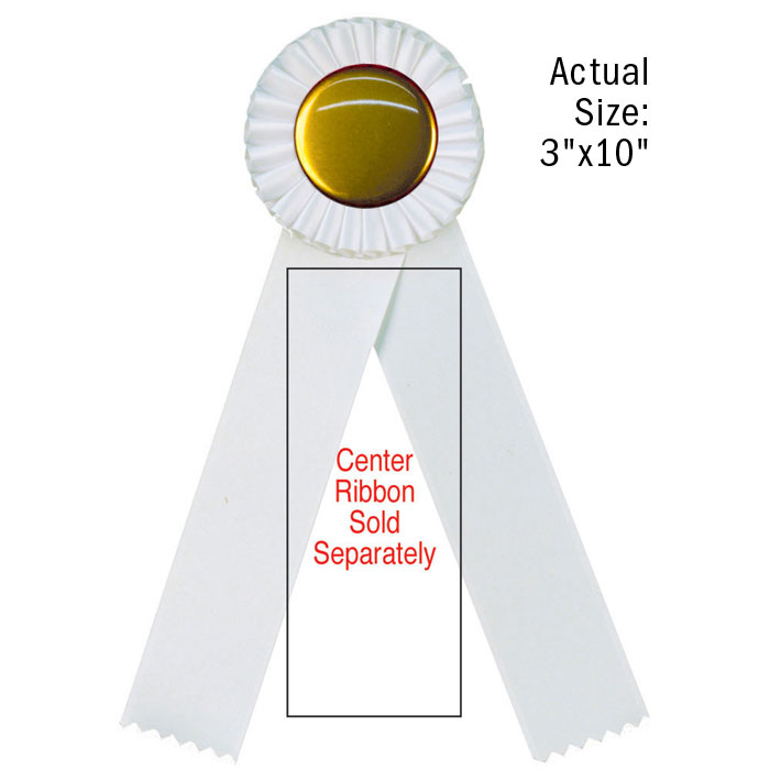 Attach any of our 2" x 8" flat ribbons (sold separately) to this 10" x 3" Ribbon Rosette. Available only in white with a gold center button. Shipped within 3 days.