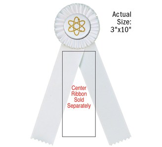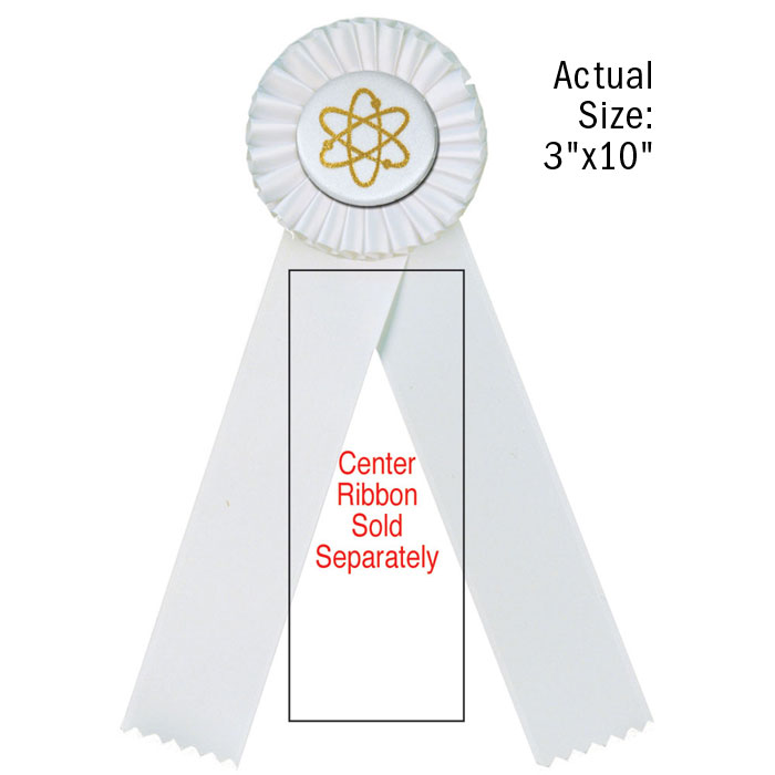 Attach any of our 2" x 8" flat ribbons (sold separately) to this 10" x 3" Ribbon Rosette. Available only in white with a center button imprinted with an atom in gold foil. Shipped within 3 days.