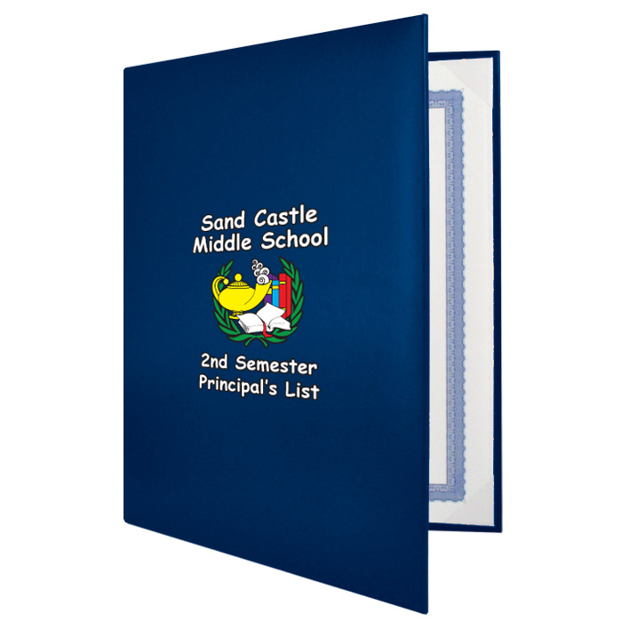 Put your school logo in full color on these classic covers. These covers are padded with a lightly textured leatherette surface. This folder holds two 8.5" x 11" documents and is hinged on the 11" side. Minimum order is 50. Imprint size is 5" x 7". Colors may be combined for quantity discounts. Shipped within 6 business days. If using a custom logo please remember to upload your artwork at www.jonesawards.com and reference your order number.