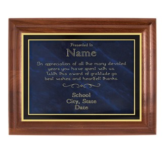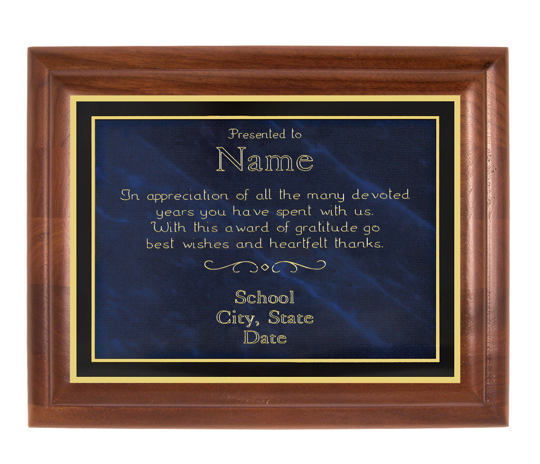 Our most elegant plaque is made from a full sheet of real blue brass engraved to reveal the gold color beneath. This 8" x 10" plaque is made from solid, genuine walnut. Any recipient will be honored to receive this substantial, beautifully hand-made award. As with all our plaques, the engraving is included in the price. Shipped within 3 business days. Order now and get a $.50 discount per item for entering engraving text online!