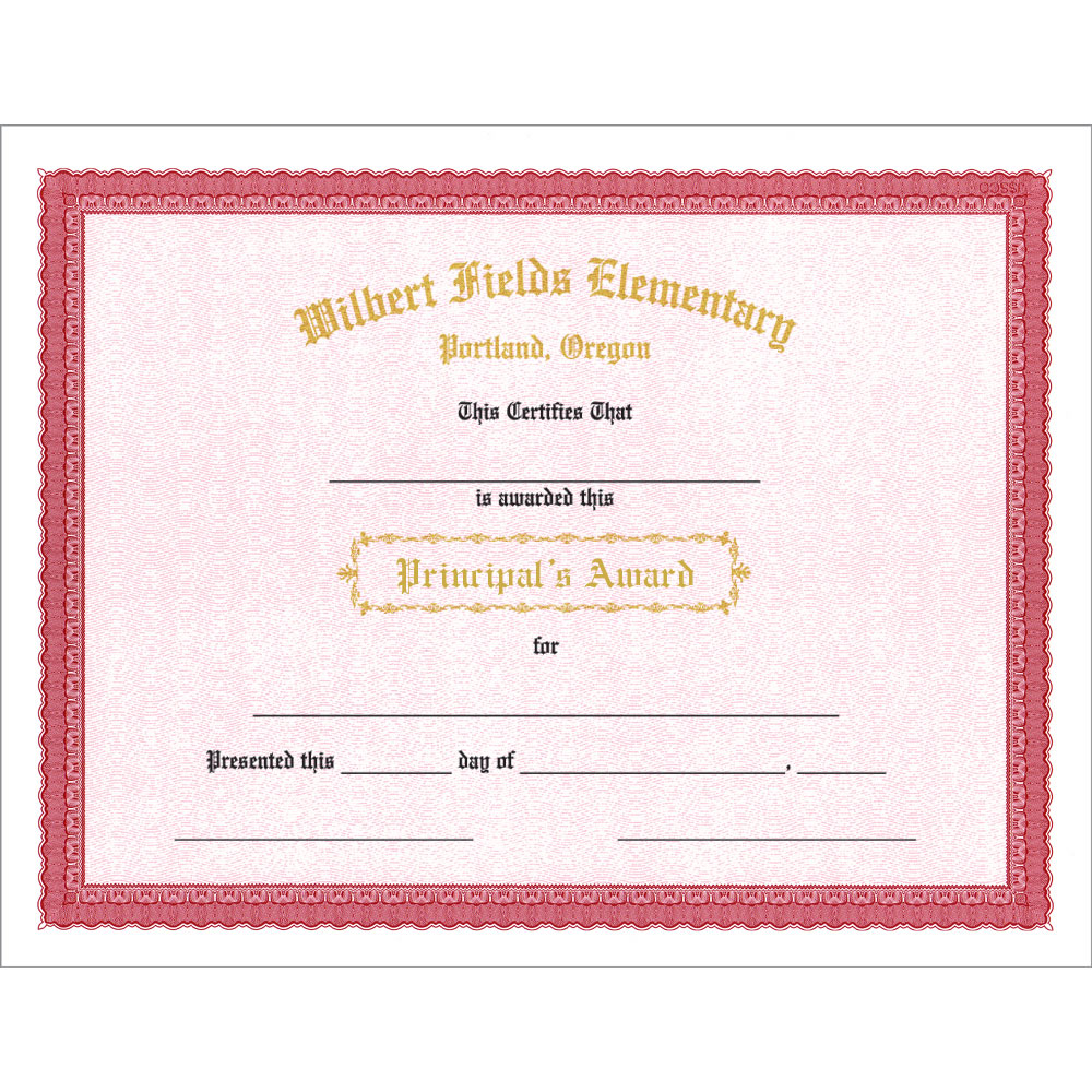 Imprint your school's name in the luminous foil color of your choice! Then choose whether you would like the city and state or one of our standard logos stamped under the school name. This 11" x 8.5" certificate comes in a variety of border colors, award titles, and paper types. You can select one of our parchtone text weight borders or our coated heavyboard papers with border and matching background. $50.00 one time die charge for first orders. Award titles may be combined for quantity discounts. Shipped within 6 business days. Your first order requires one extra week. Minimum order of 100.