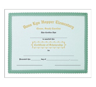 Imprint your school's name in the luminous foil color of your choice! Then choose whether you would like the city and state or one of our standard logos stamped under the school name. This 11" x 8.5" certificate comes in a variety of border colors, award titles, and paper types. You can select one of our parchtone text weight borders or our coated heavyboard papers with border and matching background. $50.00 one time die charge for first orders. Award titles may be combined for quantity discounts. Shipped within 6 business days. Your first order requires one extra week. Minimum order of 100.
