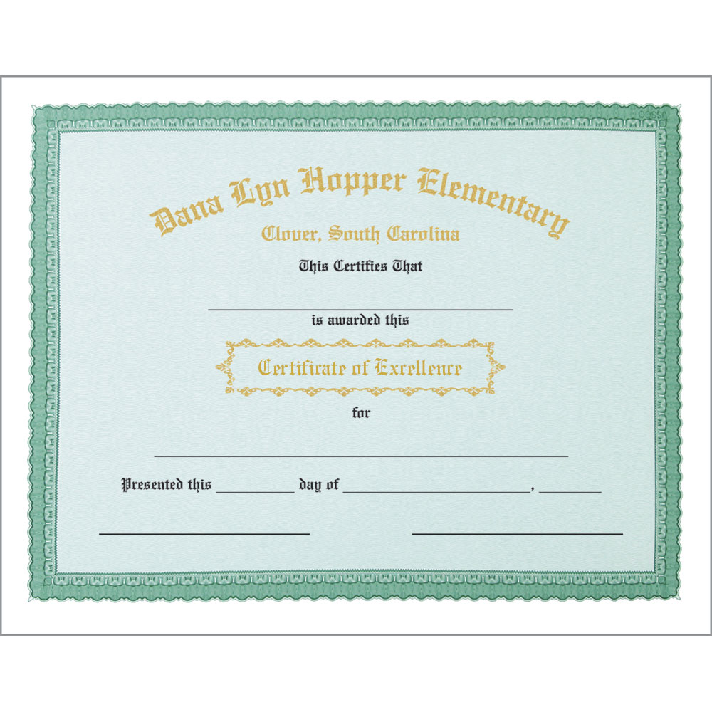 Imprint your school's name in the luminous foil color of your choice! Then choose whether you would like the city and state or one of our standard logos stamped under the school name. This 11" x 8.5" certificate comes in a variety of border colors, award titles, and paper types. You can select one of our parchtone text weight borders or our coated heavyboard papers with border and matching background. $50.00 one time die charge for first orders. Award titles may be combined for quantity discounts. Shipped within 6 business days. Your first order requires one extra week. Minimum order of 100.