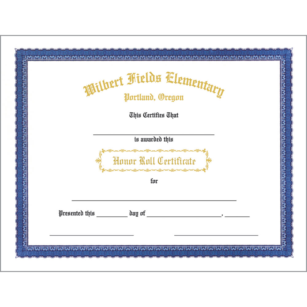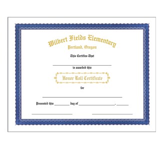 Imprint your school's name in the luminous foil color of your choice! Then choose whether you would like the city and state or one of our standard logos stamped under the school name. This 11" x 8.5" certificate comes in a variety of border colors, award titles, and paper types. You can select one of our parchtone text weight borders or our coated heavyboard papers with border and matching background. $50.00 one time die charge for first orders. Award titles may be combined for quantity discounts. Shipped within 6 business days. Your first order requires one extra week. Minimum order of 100.