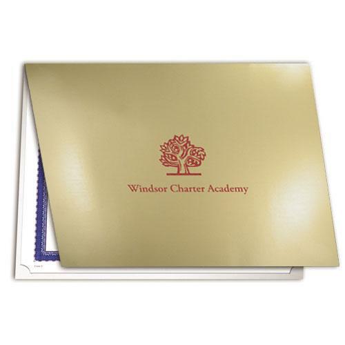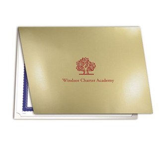 These inexpensive folders hold either vertical or horizontal 8.5" x 11" documents. Give us your school name, city and state or logo and we'll stamp it in your choice of foil color. Minimum order is 50 folders. Maximum Imprint is 3" x 5". Custom die charge of $50.00 applies to your first order only. The same die may be used for any other certificate or certificate holder. Shipped within 6 business days after receipt of order. Your first order requires one extra week. Allow additional time for shipping.