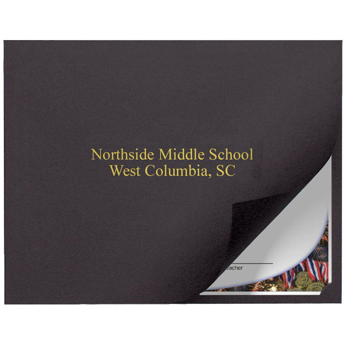 Add your school name or logo to one of these heavyweight, linen folders. Each 9.25" x 11.5" folder features slots for vertical or horizontal documents. We'll imprint your school's name in your choice of foil color. Holds one 8.5" x 11" or 8" x 10" document vertically or horizontally. Imprint size is 3" x 5". $50 die charge applies to first order. Shipped within 3 business days. First order takes one extra week.