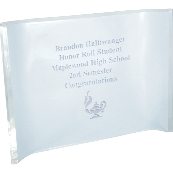 The beauty of this award is the simplicity of the design. It is comprised of a substantial acrylic curve with wording and logo etched into the surface. The curved design allows the award to stand freely on any flat surface. Free engraving included. Shipped fully assembled in 3 business days. Order now and get a $.50 discount per item for entering engraving text online!