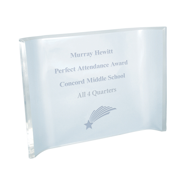 The beauty of this award is the simplicity of the design. It is comprised of a substantial acrylic curve with wording and logo etched into the surface. The curved design allows the award to stand freely on any flat surface. Free engraving included. Shipped fully assembled in 3 business days. Order now and get a $.50 discount per item for entering engraving text online!