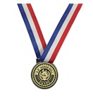 These 1.75" medals with attached 7/8" x 34" neck ribbons are in stock to ship within 24 hours. Sold in sets of 10 per title with mylars shipped unattached. Only available with red, white and blue neck ribbon. NECK RIBBON IS PRE-ATTACHED! Price shown is per set of 10 medals per title. These medals cannot be engraved.