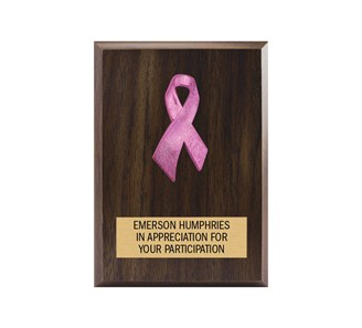 This affordable 4" x 6" walnut finished plaque includes three FREE lines of engraving. The awareness ribbon centerpiece is available in six ribbon colors; pink, red, gold, blue, green or purple. Shipped within 3 business days. Enter your 3 lines of text (20 characters per line) on our website and get a $.50 discount per item!