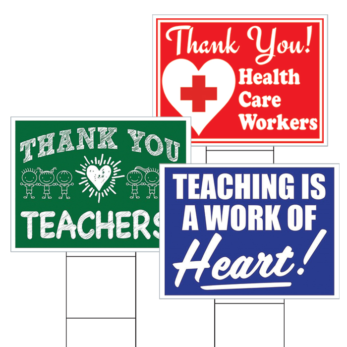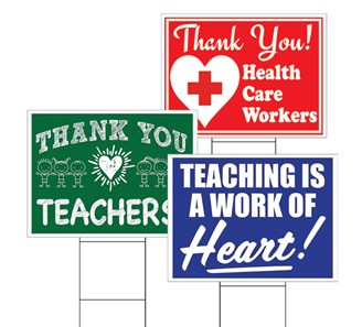 Say thanks to your dedicated health care professionals who are working tirelessly to keep us healthy. Use our design or create your own. This 24" x 18" sign is printed in one color on one side of durable Econoplast fluted plastic. Price includes all artwork charges and 9" x 24" double "H" stakes. We'll produce your custom sign in just 5 business days. Allow additional time for shipping.