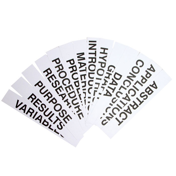 These 1.5" x 8.5" self-adhesive titles are sold in sets of 14 titles that you can apply to your display boards. Titles include: Abstract, Applications, Conclusions, Data, Graph, Hypothesis, Introduction, Materials, Problem, Procedure, Purpose, Research, Results, Variables. Same day shipping for stock orders placed by 3:00PM EST.