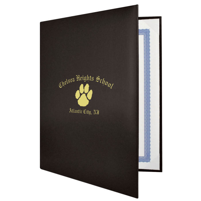 These padded diploma covers feature a lightly textured leatherette surface and your logo and/or wording foil stamped on the cover. Holds one 8.5" x 11" document vertically or horizontally. Minimum order is 50. Maximum imprint size is 3" x 5". Cover colors may be combined for quantity discounts. A $50 die charge applies to first order. Shipped within 6 business days. First order takes one extra week for die production. If using a custom logo please remember to upload your artwork at www.jonesawards.com and reference your order number.