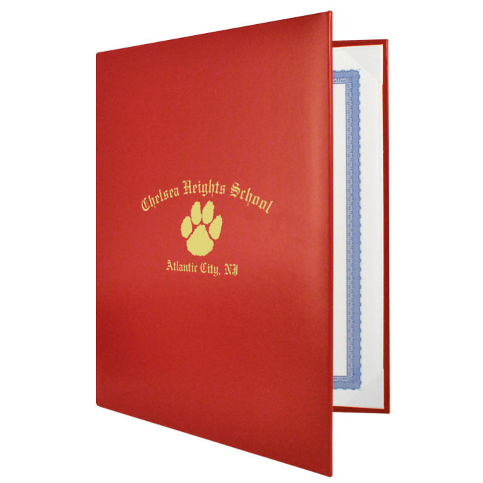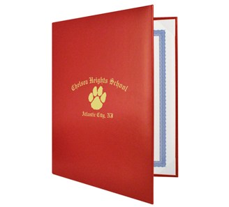 These padded diploma covers feature a lightly textured leatherette surface and your logo and/or wording foil stamped on the cover. Holds one 8.5" x 11" document vertically or horizontally. Minimum order is 50. Maximum imprint size is 3" x 5". Cover colors may be combined for quantity discounts. A $50 die charge applies to first order. Shipped within 6 business days. First order takes one extra week for die production. If using a custom logo please remember to upload your artwork at www.jonesawards.com and reference your order number.