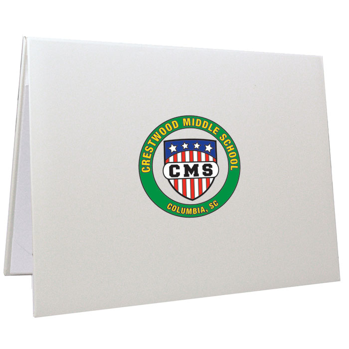 Put your school logo in full color on these classic covers. These covers are padded with a lightly textured leatherette surface. Each 9" x 11½" cover holds one 8½" x 11" document securely with satin ribbon corners. Also available in black and navy in a two sided version that holds two documents. Minimum order is 50. Imprint size is 5" x 7". Shipped within 6 business days. If using a custom logo please remember to upload your artwork at www.jonesawards.com and reference your order number.