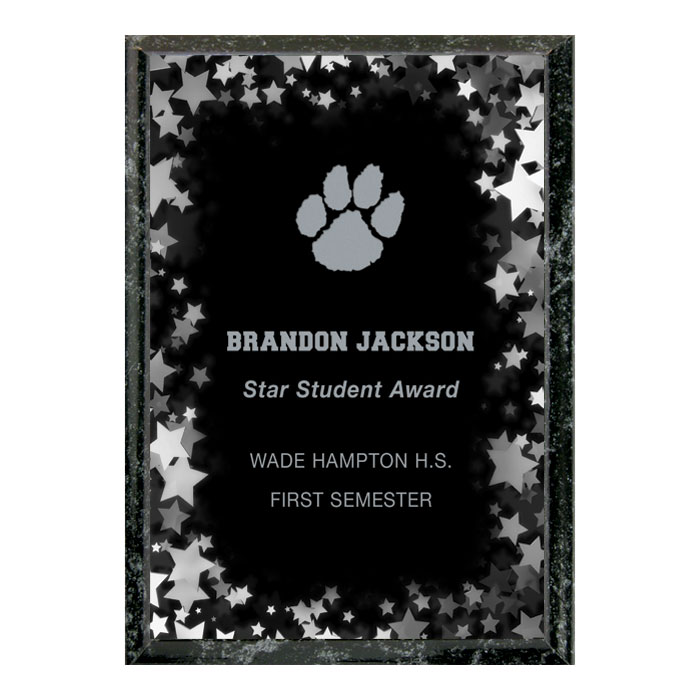 Here is your opportunity to have your engraved wording inscribed on a stunning full color plaque. Each beautiful plate is mounted on a 5" x 7" black marble finished plaque board. Pick one - or many - of the 11 styles available, and we'll combine for quantity discounts. Plate accommodates 4 lines of text. Board features slots for hanging. Ships fully assembled in 3 days. Order now and get a $.50 discount per item for entering engraving text online!