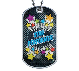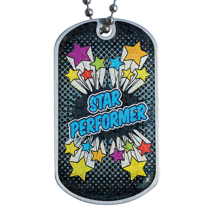 This award gives you both glitter and bold color. Our 2" x 1.125" aluminum Glitter Tagz ship with attached glitter, domed inserts. A 24" chain is included so that your students can wear their awards with pride. Combine titles for quantity discounts. Shipped fully assembled within 24 hours.