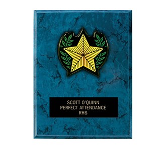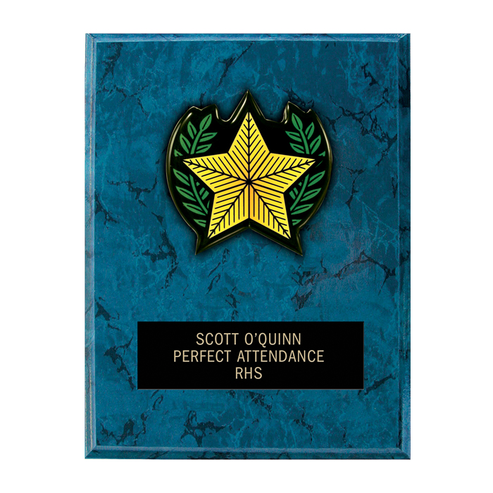 This 6" x 8" Blue Marble finished plaque includes your choice of engraved lettering and our newest plaque reliefs. Ships in 3 business days. Order now and get a $.50 discount per item for entering engraving text online!