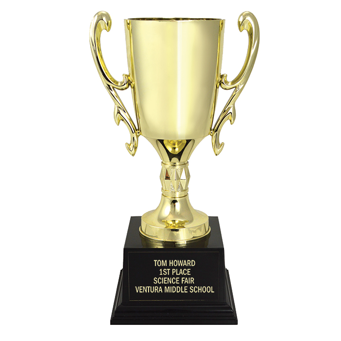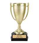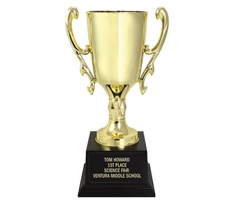 Our biggest award cup in all of its grandeur is a must have! It stands at an impressive height, coming in at just under 12" tall! The cup is exquisitely formed in shiny gold. We'll engrave your plate to your specifications, up to 4 lines with 24 characters and spaces each line. Ships fully assembled in 3 business days. Order now and get a $.50 discount per item for entering engraving text online!