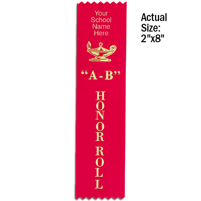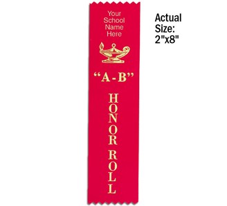 Personalize our premium stock ribbons with your school's name in gold foil. Use the standard ribbon color shown here or pick your color. Minimum order without $20.00 setup charge is 100. Ships within 5 business days. Quantity discount applies to total of Personalized Ribbons. Ribbons are 2" x 8".