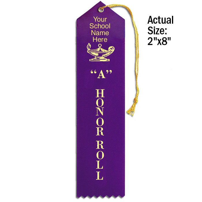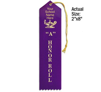 Personalize our premium stock ribbons with your school's name in gold foil. Use the standard ribbon color shown here or pick your color. Minimum order without $20.00 setup charge is 100. Ships within 5 business days. Quantity discount applies to total of Personalized Ribbons. Ribbons are 2" x 8".