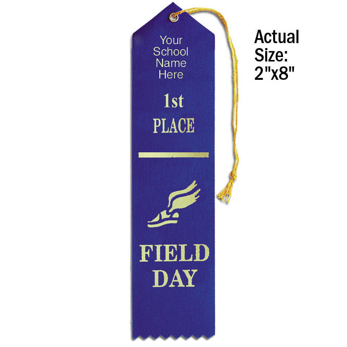 Personalize our premium stock ribbons with your school's name in gold foil. Use the standard ribbon color shown here or pick your color. Minimum order without $20.00 setup charge is 100. Ships within 5 business days. Quantity discount applies to total of Personalized Ribbons. Ribbons are 2" x 8".