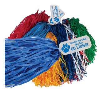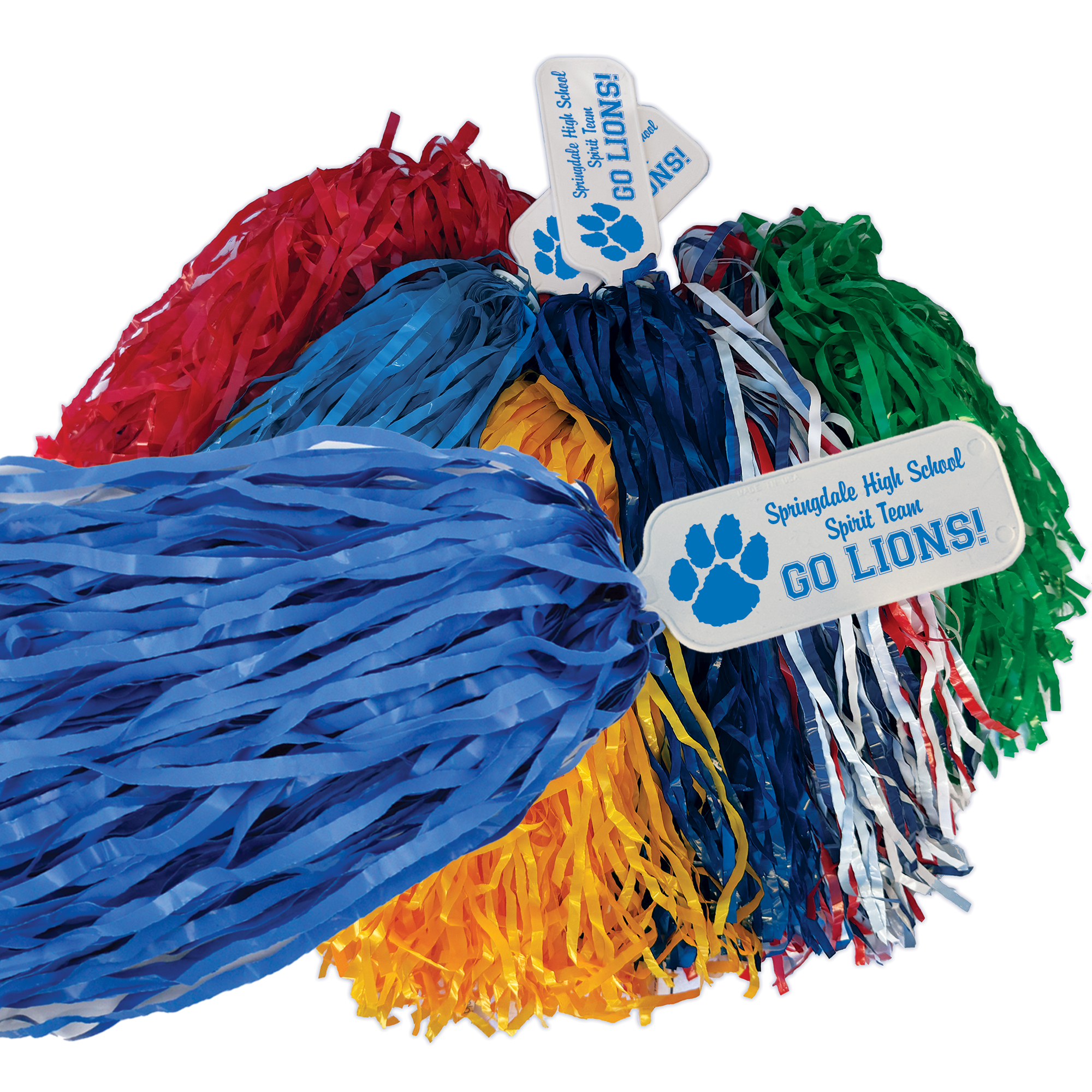 Create your own custom Pom Poms for any event. These 16" Pom Poms feature 500 vibrantly colored streamers and your choice of up to 4 streamer colors. You can also customize the safety paddle with your choice of text and logo. The 12" shed-resistant streamers are securely bound to a 4" plastic paddle. Shipped within 8 business days after receipt of order.
