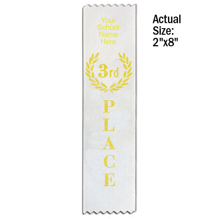 Personalize our premium stock ribbons with your school's name in gold foil. Use the standard ribbon color shown here or pick your color. Minimum order without $20.00 setup charge is 100. Ships within 5 business days. Quantity discount applies to total of Personalized Ribbons. Ribbons are 2" x 8".