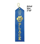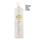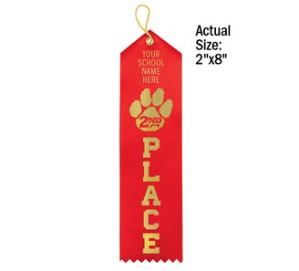 Personalize our premium satin paw award ribbons with your school's name in gold foil. Use the standard ribbon color shown here or pick your color. Minimum order without $20.00 setup charge is 100. Ships within 5 business days. Quantity discount applies to total of Personalized Ribbons. Ribbons are 2" x 8".
