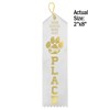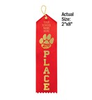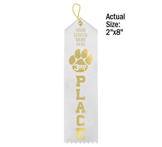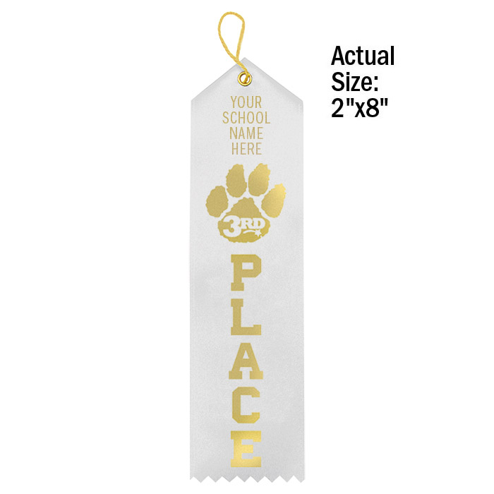 Personalize our premium satin paw award ribbons with your school's name in gold foil. Use the standard ribbon color shown here or pick your color. Minimum order without $20.00 setup charge is 100. Ships within 5 business days. Quantity discount applies to total of Personalized Ribbons. Ribbons are 2" x 8".