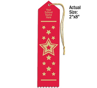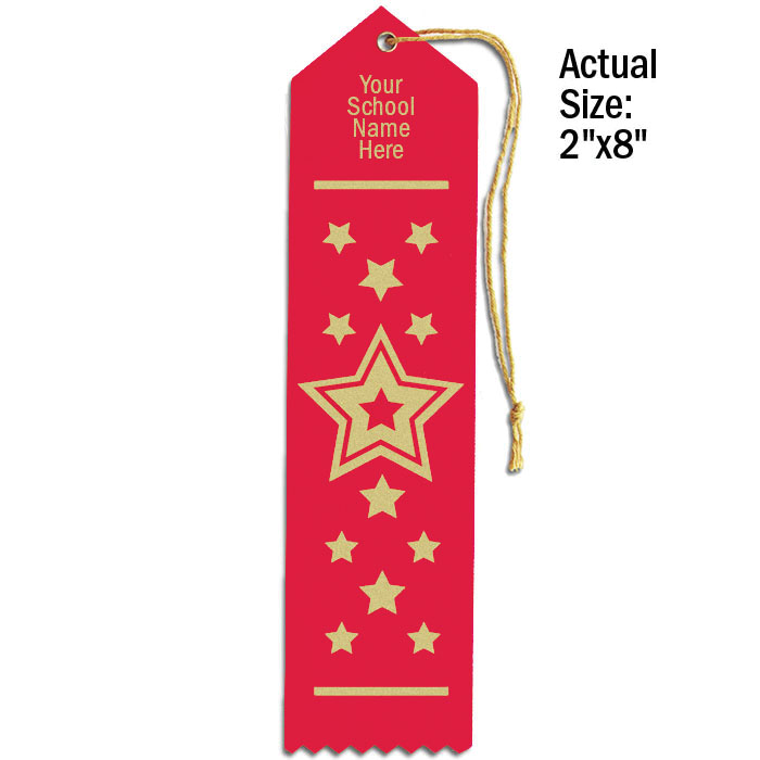 Personalize our premium stock ribbons with your school's name in gold foil. Use the standard ribbon color shown here or pick your color. Minimum order without $20.00 setup charge is 100. Ships within 5 business days. Quantity discount applies to total of Personalized Ribbons. Ribbons are 2" x 8".