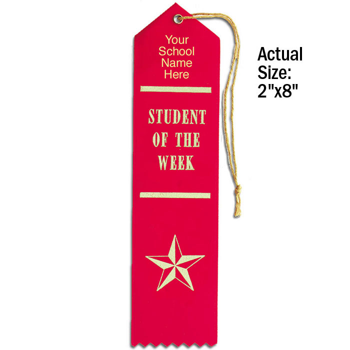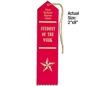 Personalize our premium stock ribbons with your school's name in gold foil. Use the standard ribbon color shown here or pick your color. Minimum order without $20.00 setup charge is 100. Ships within 5 business days. Quantity discount applies to total of Personalized Ribbons. Ribbons are 2" x 8".