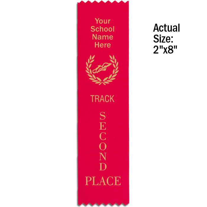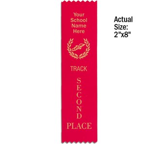 Personalize our premium stock ribbons with your school's name in gold foil. Use the standard ribbon color shown here or pick your color. Minimum order without $20.00 setup charge is 100. Ships within 5 business days. Quantity discount applies to total of Personalized Ribbons. Ribbons are 2" x 8".