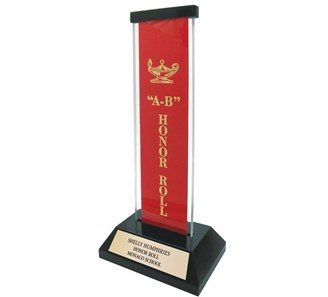 Jones Exclusive! A 10" acrylic trophy with the gorgeous color and foil of our ribbon line. Includes one of our premium, full-sized, flat ribbons. We'll laser print your personalized text on gold foil. Quantity discounts apply to trophies using the same ribbon title. Shipped within 3 days after receipt of order. Allow additional time for shipping. Order now and get a $.50 discount per item for entering engraving text online! Size: 4.1875" x 10"