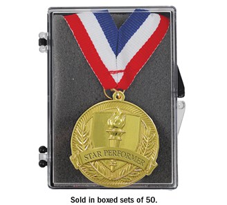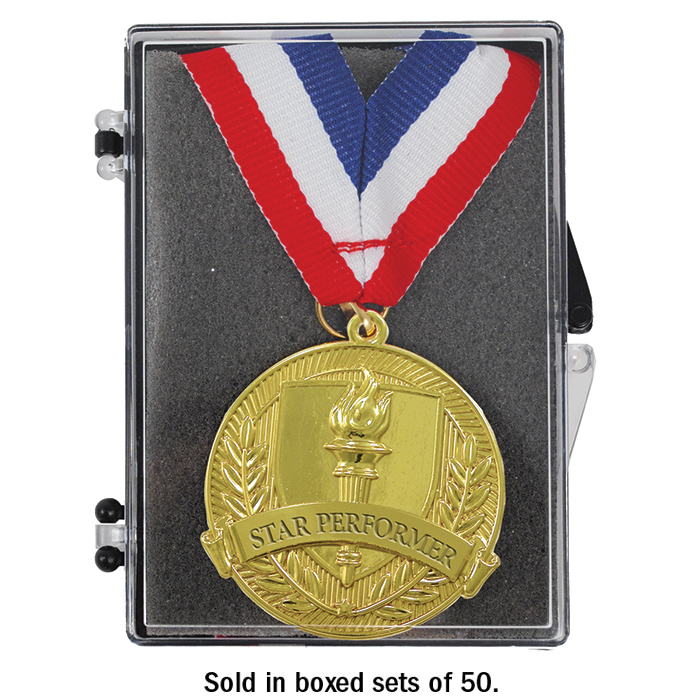 All you have to do is hand them out! Easy! We specially packaged these sets of medals for that busy award program. Each medal is attached to a red, white and blue neck ribbon and elegantly displayed in a padded acrylic presentation box. Choose one of our six preselected titles from our popular shining achievement medal lines and we'll ship your set of 50 boxed medals in just 24 hours.