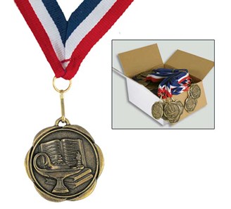 Our lightweight, 1.75" medals are a true budget and time saver! Sold in Sets of 100 only and include a top-quality .875" neck ribbon attached. Combine titles for quantity discounts. Only available with red, white and blue neck ribbon. Ship in 24 hours. NECK RIBBON IS PRE-ATTACHED! Price Shown is per bag of 100 medals per title.