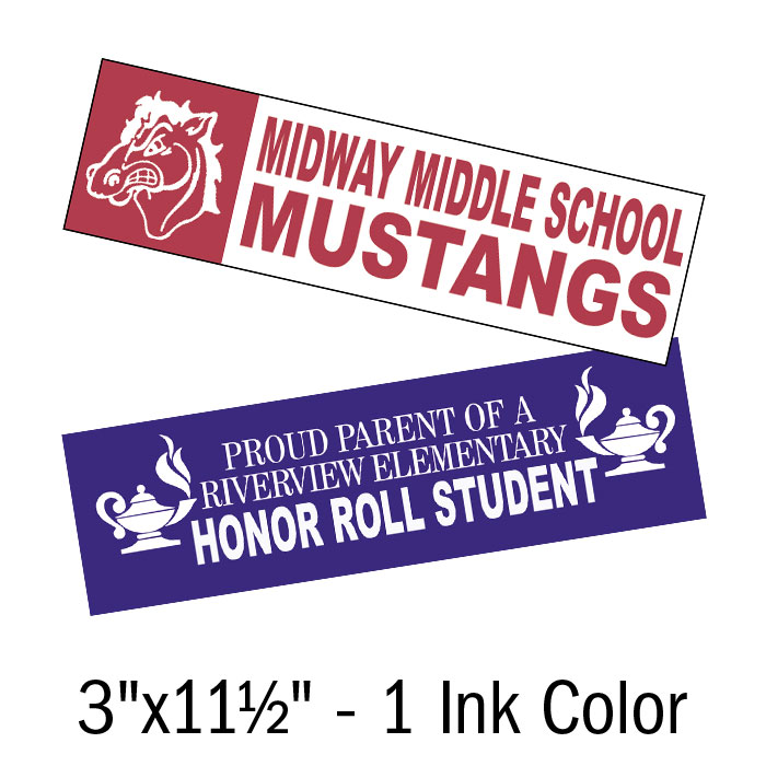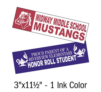 If you need bumper stickers, then you need to try ours. We make them with long-lasting vinyl that resists cracking, fading and peeling. Plus, they can be removed without leaving behind any sticky residue - making everyone much more likely to display them with pride! And our price is great, too - no setup charge, no art charges - everything is included. Size: 3" x 11.5" Color: One ink color. Minimum order is 125. White for lettering or background does not count as a color. Shipped within 7 days after receipt of order.
