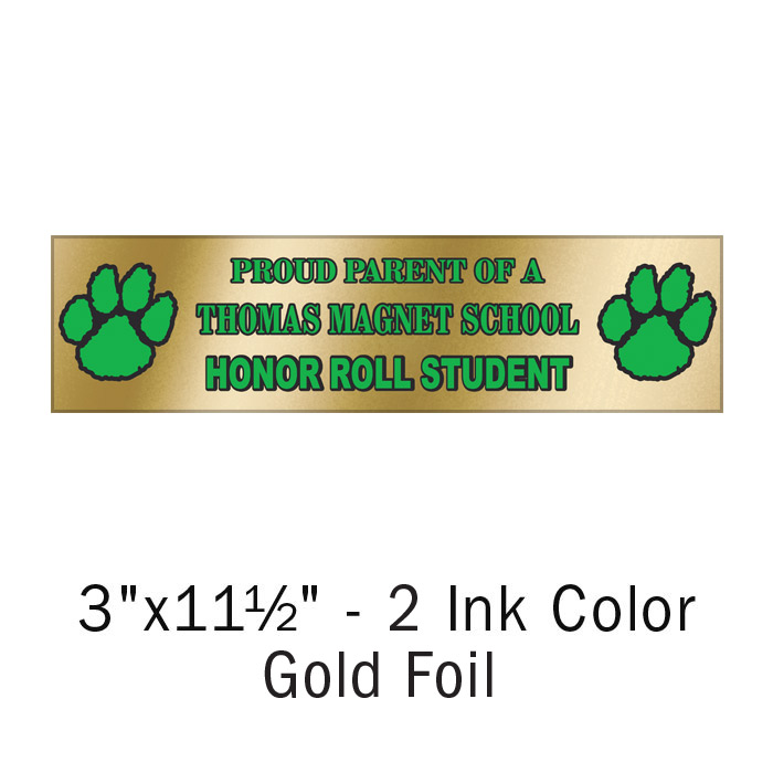 If you need bumper stickers, then you need to try ours. We make them with long-lasting vinyl that resists cracking, fading and peeling. Plus, they can be removed without leaving behind any sticky residue - making everyone much more likely to display them with pride! And our price is great, too - no setup charge, no art charges - everything is included. Size: 3" x 11.5" Color: Two ink color on gold foil. Minimum order is 125. Shipped within 7 days after receipt of order.