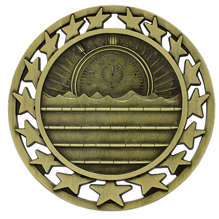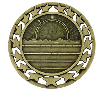 A big, 2.5" medal at a great price. This terrific star design is available in gold in stock for immediate shipment in all 11 titles. The torch and lamp can be shipped in silver and bronze within 24 hours as well. For other title and color combinations, we need an additional 5 days. Combine titles for quantity discounts.