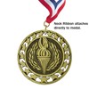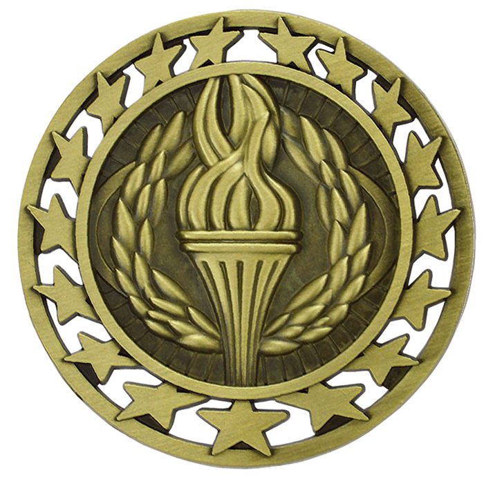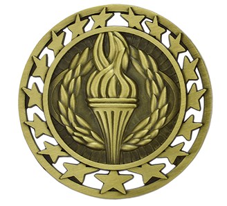 A big, 2.5" medal at a great price. This terrific star design is available in gold in stock for immediate shipment in all 11 titles. The torch and lamp can be shipped in silver and bronze within 24 hours as well. For other title and color combinations, we need an additional 5 days. Combine titles for quantity discounts.