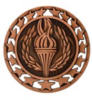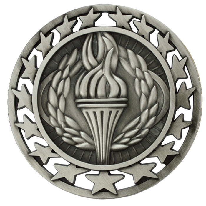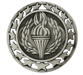 A big, 2.5" medal at a great price. This terrific star design is available in gold in stock for immediate shipment in all 11 titles. The torch and lamp can be shipped in silver and bronze within 24 hours as well. For other title and color combinations, we need an additional 5 days. Combine titles for quantity discounts.